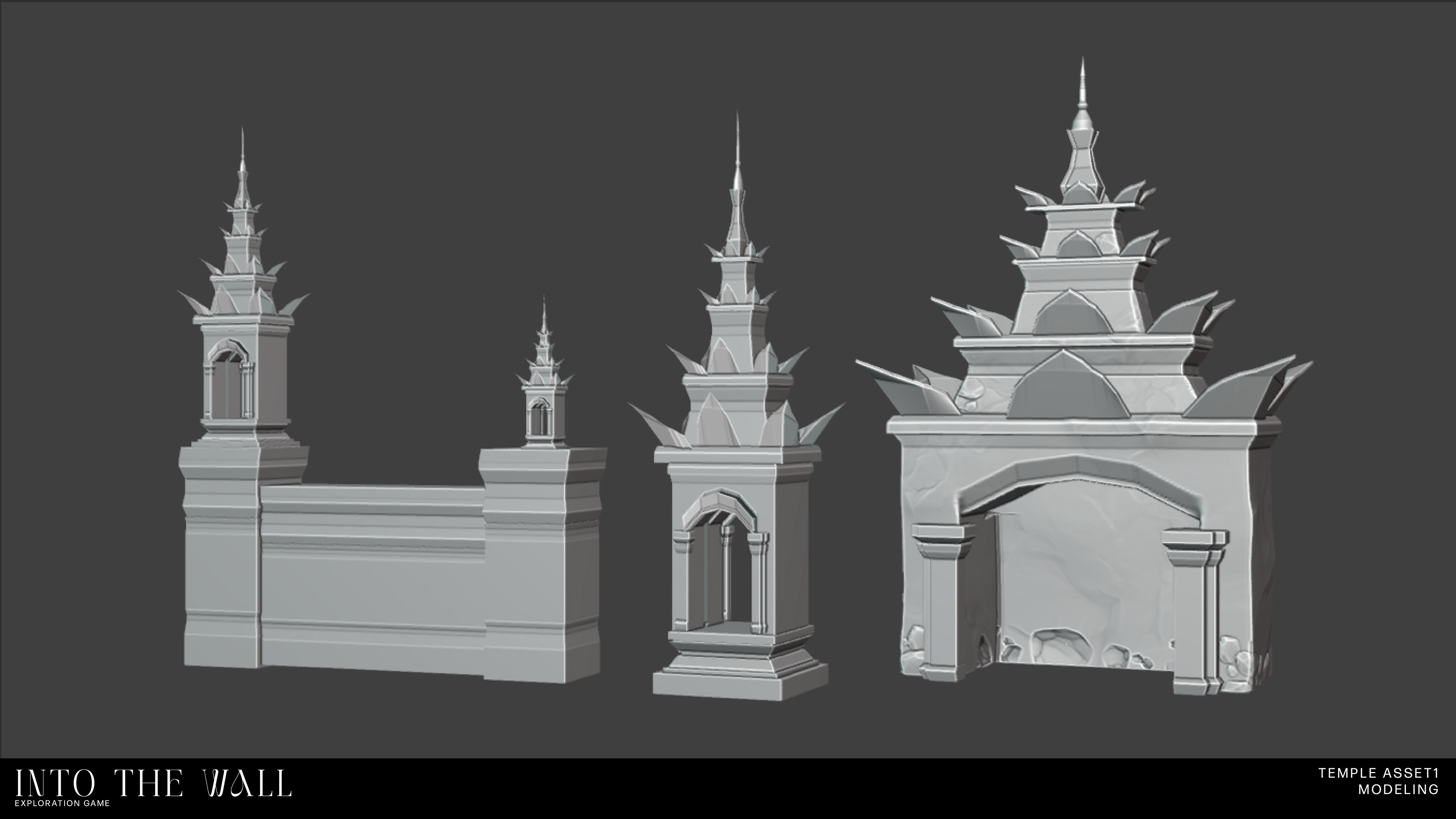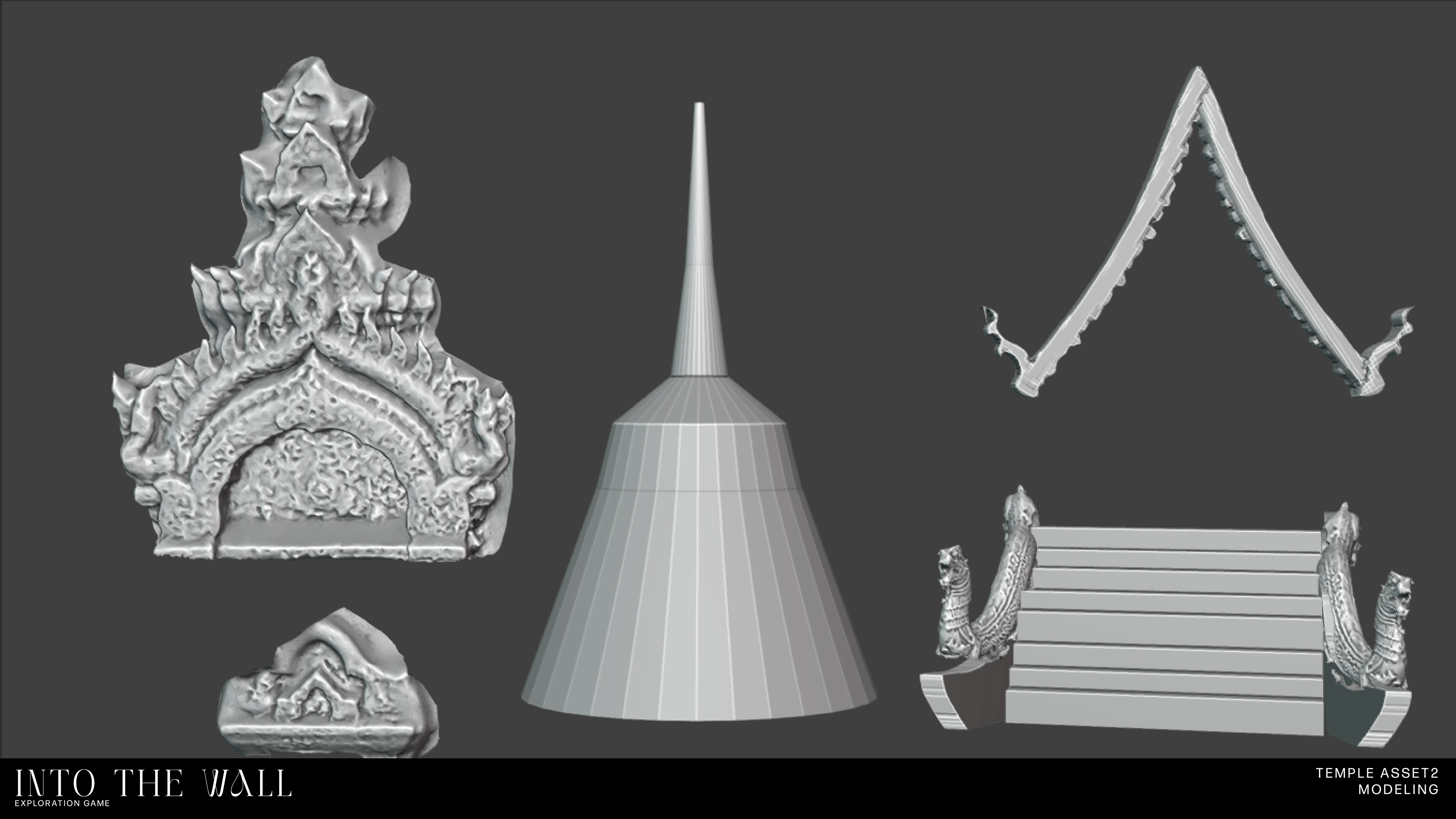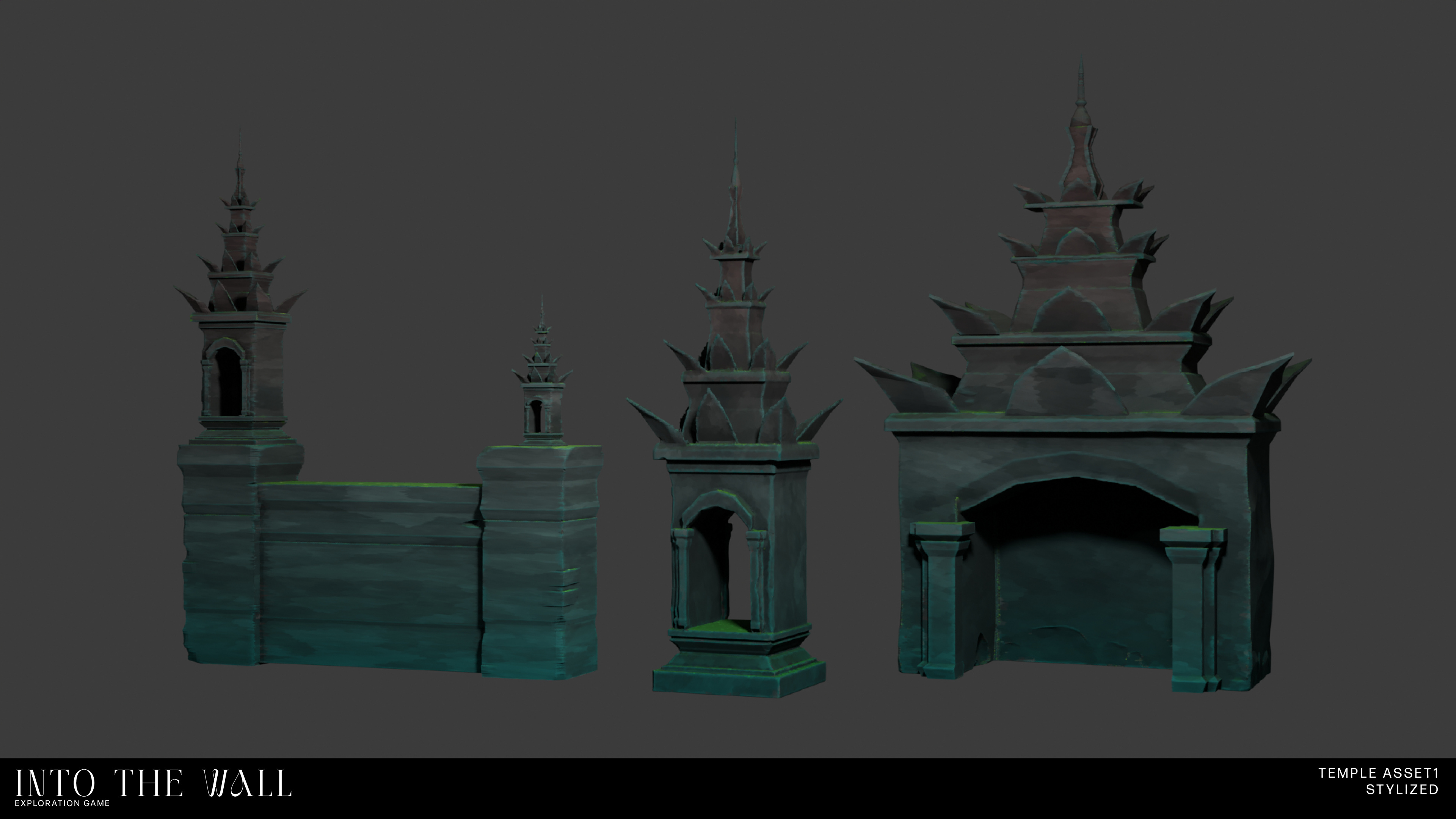 Inspired by 3D scans of temples across Thailand, these structures were captured using RealityCapture and then remodeled to clean up the topology. Two versions of each mesh were created: a low-polygon version for in-game use and a higher-polygon version to bake normal maps for material creation. All assets in this game feature hand-painted, stylized PBR materials, giving the ruins a mossy, gradient-brick appearance.
