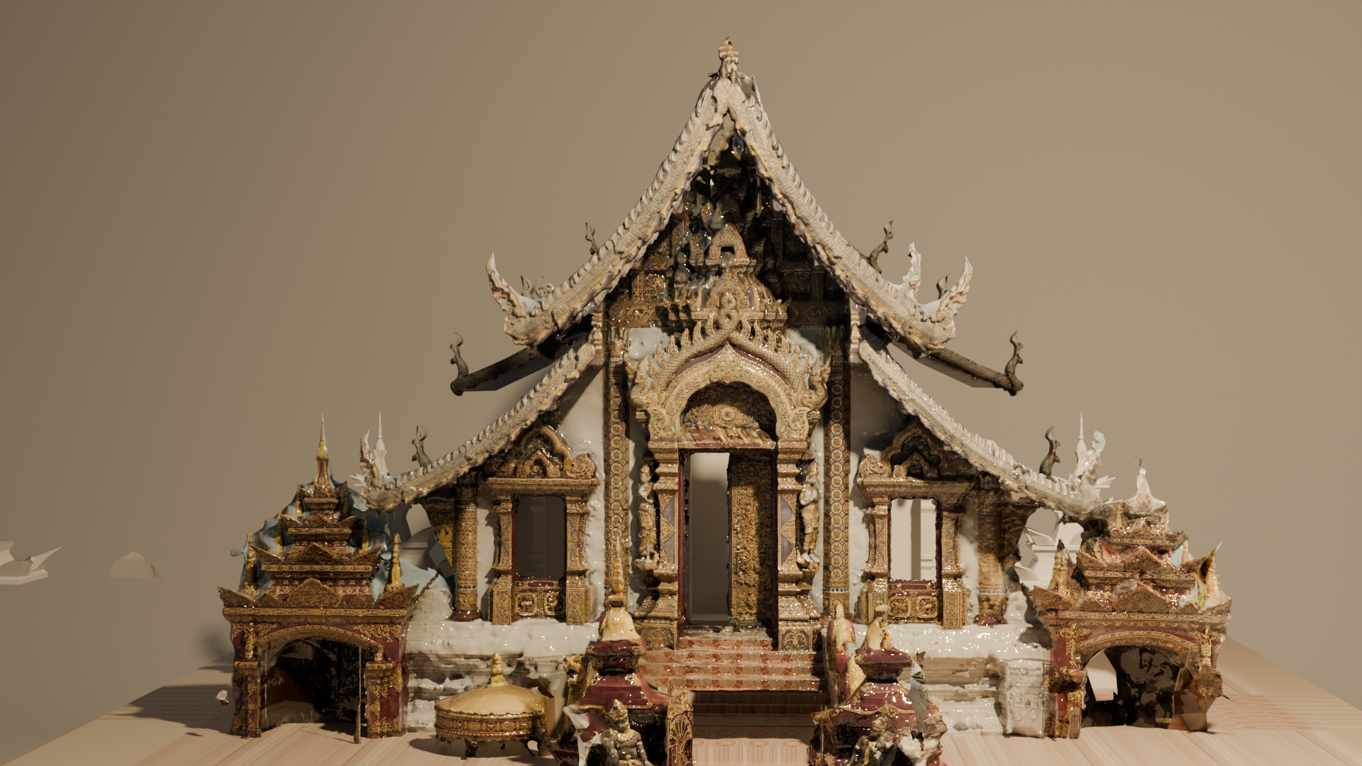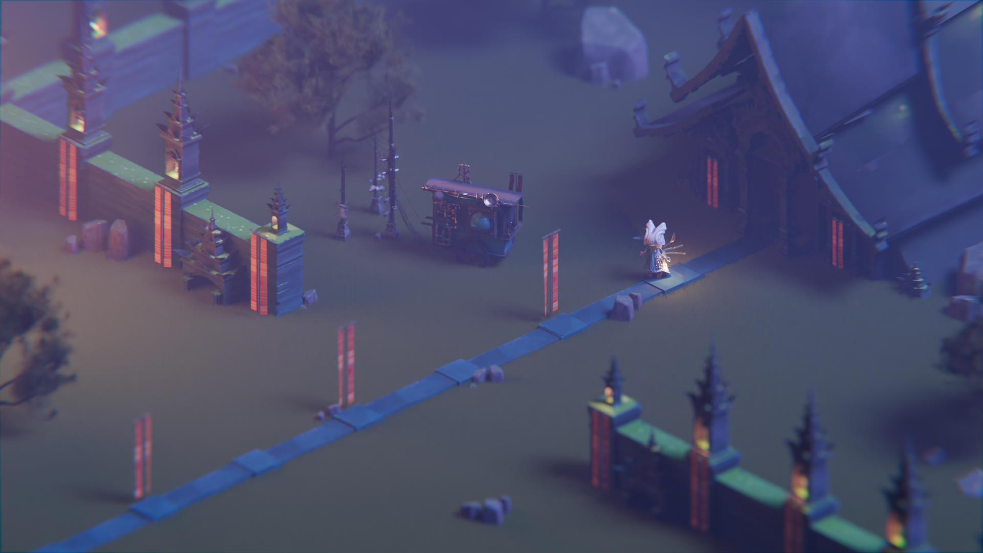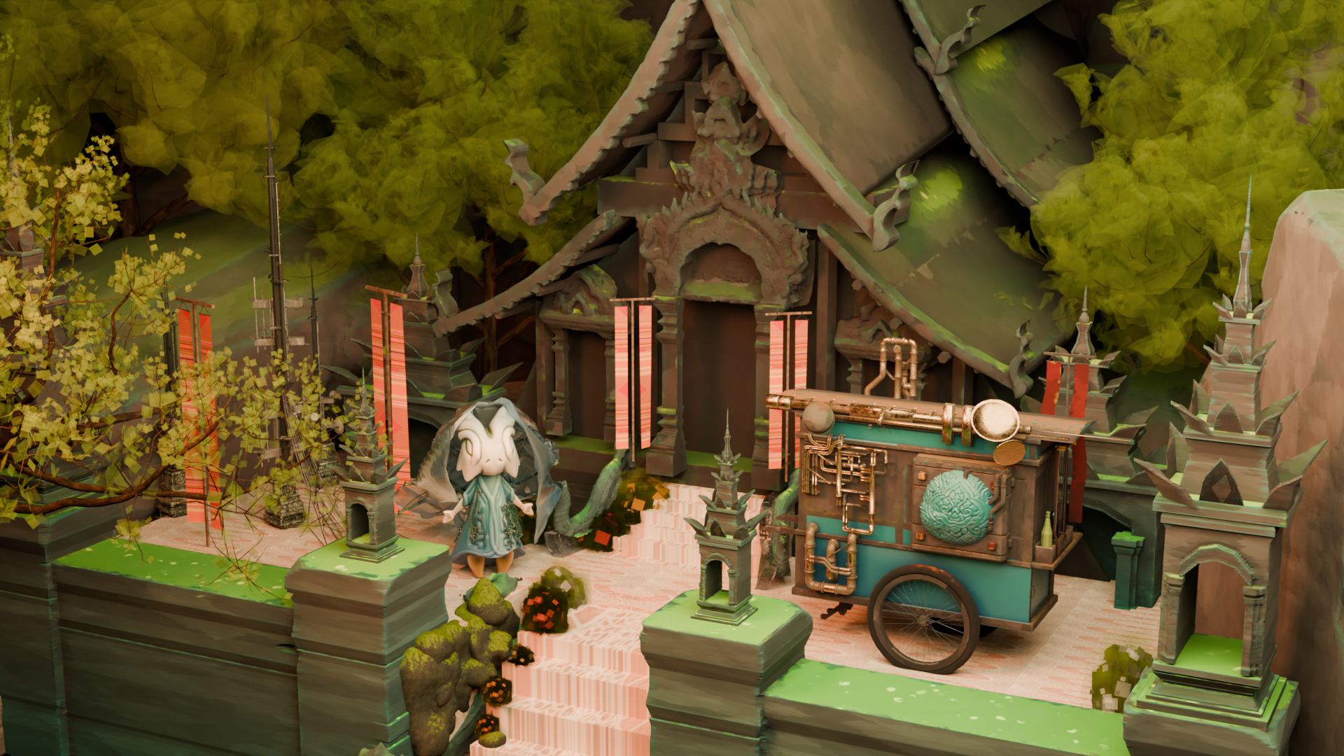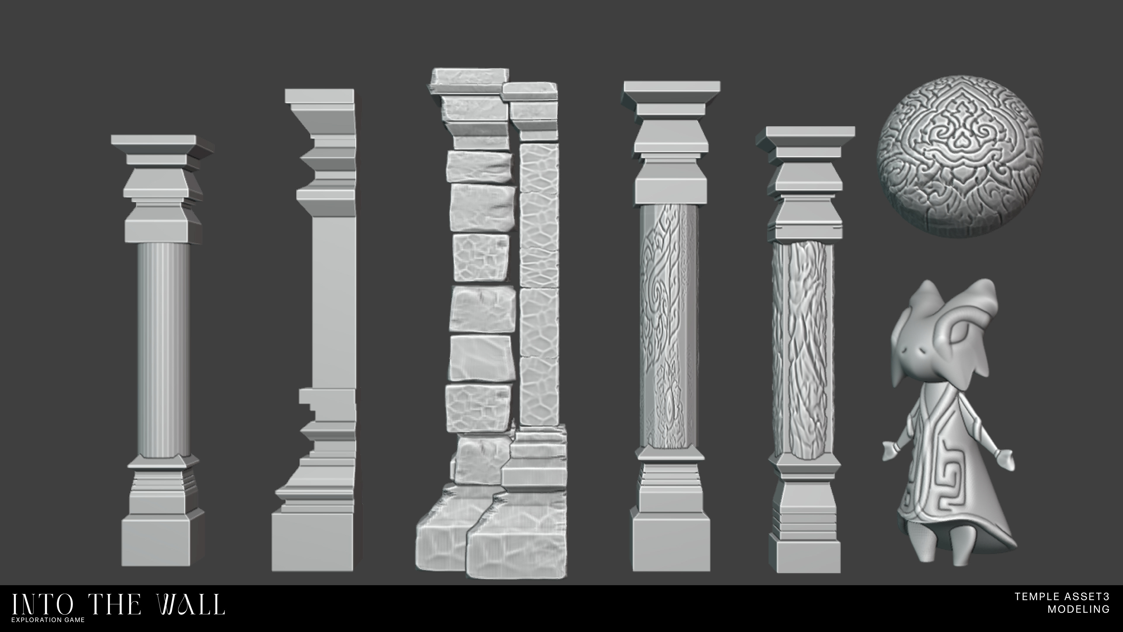 Inspired by 3D scans of temples across Thailand, these structures were captured using RealityCapture and then remodeled to clean up the topology. Two versions of each mesh were created: a low-polygon version for in-game use and a higher-polygon version to bake normal maps for material creation. All assets in this game feature hand-painted, stylized PBR materials, giving the ruins a mossy, gradient-brick appearance.