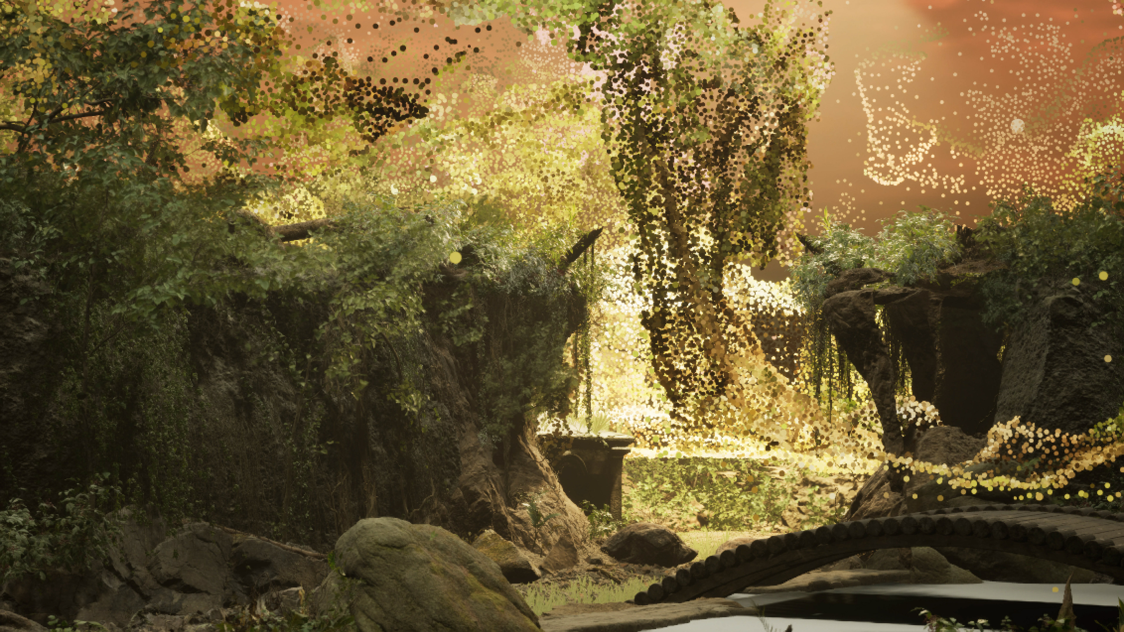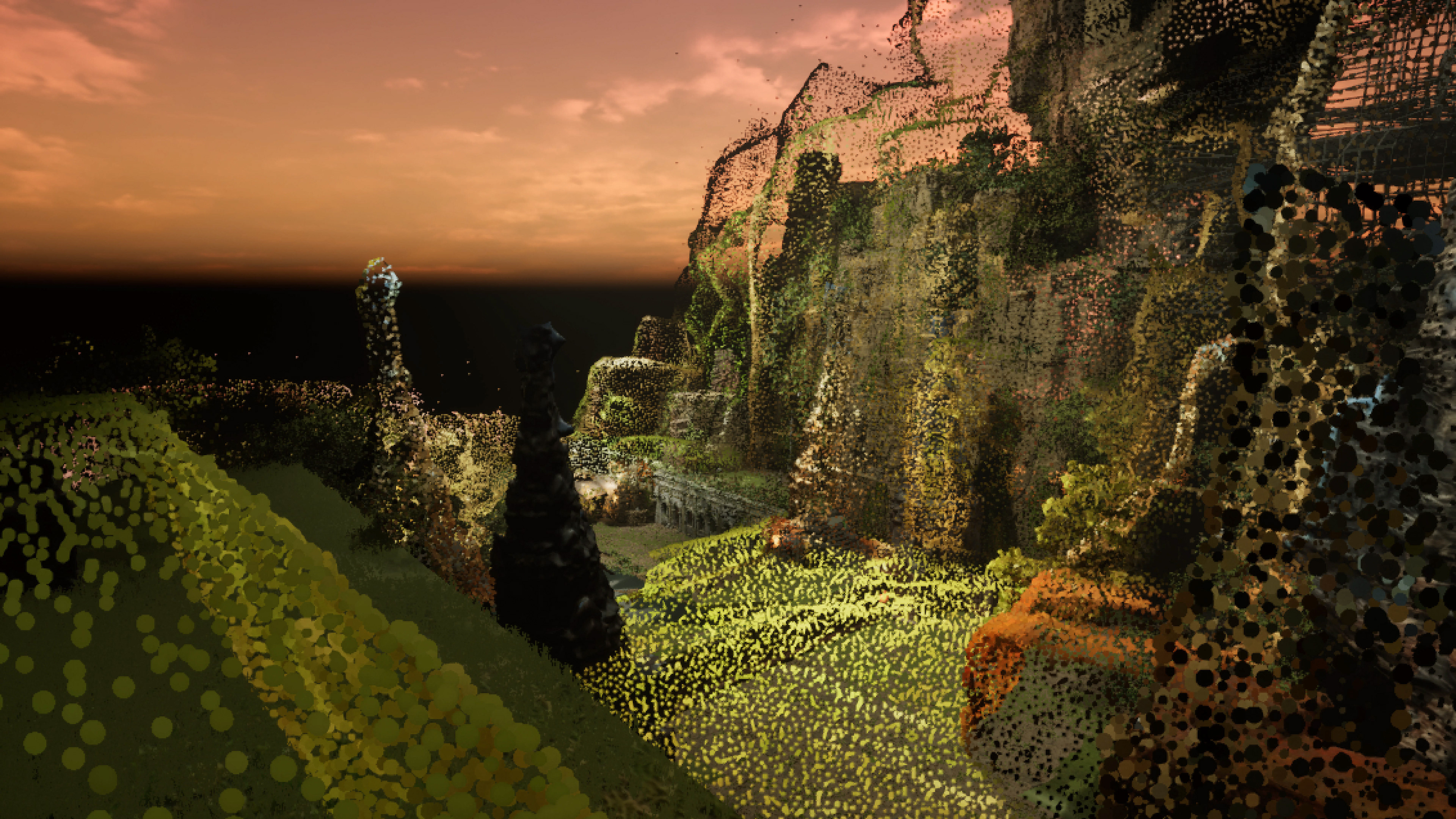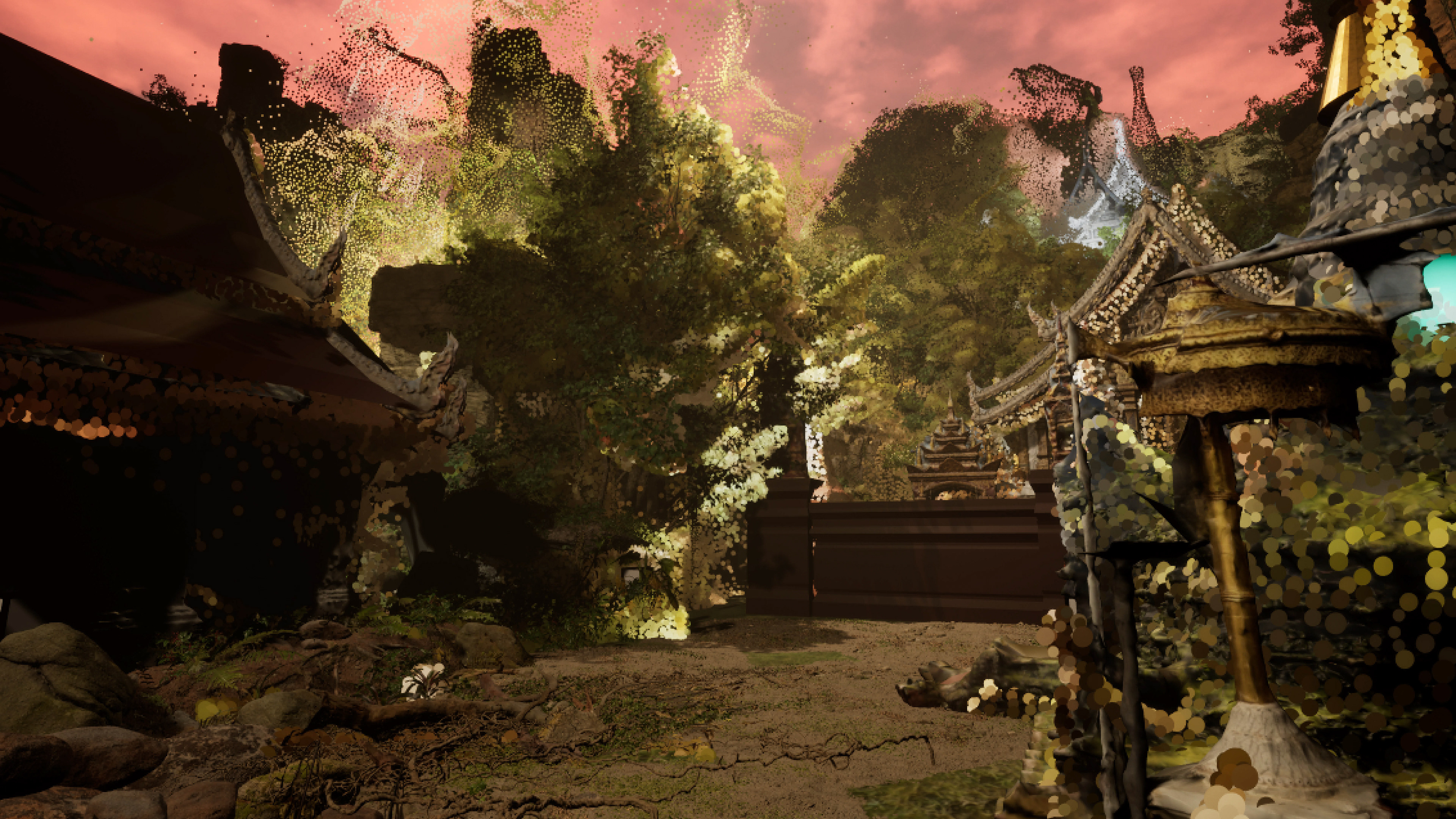 Point-cloud scene prototype for game environment: Set up the environment with photogrammetry assets, render, and remake the point cloud from a digital version of the place, then put it back to create the illusion effect.