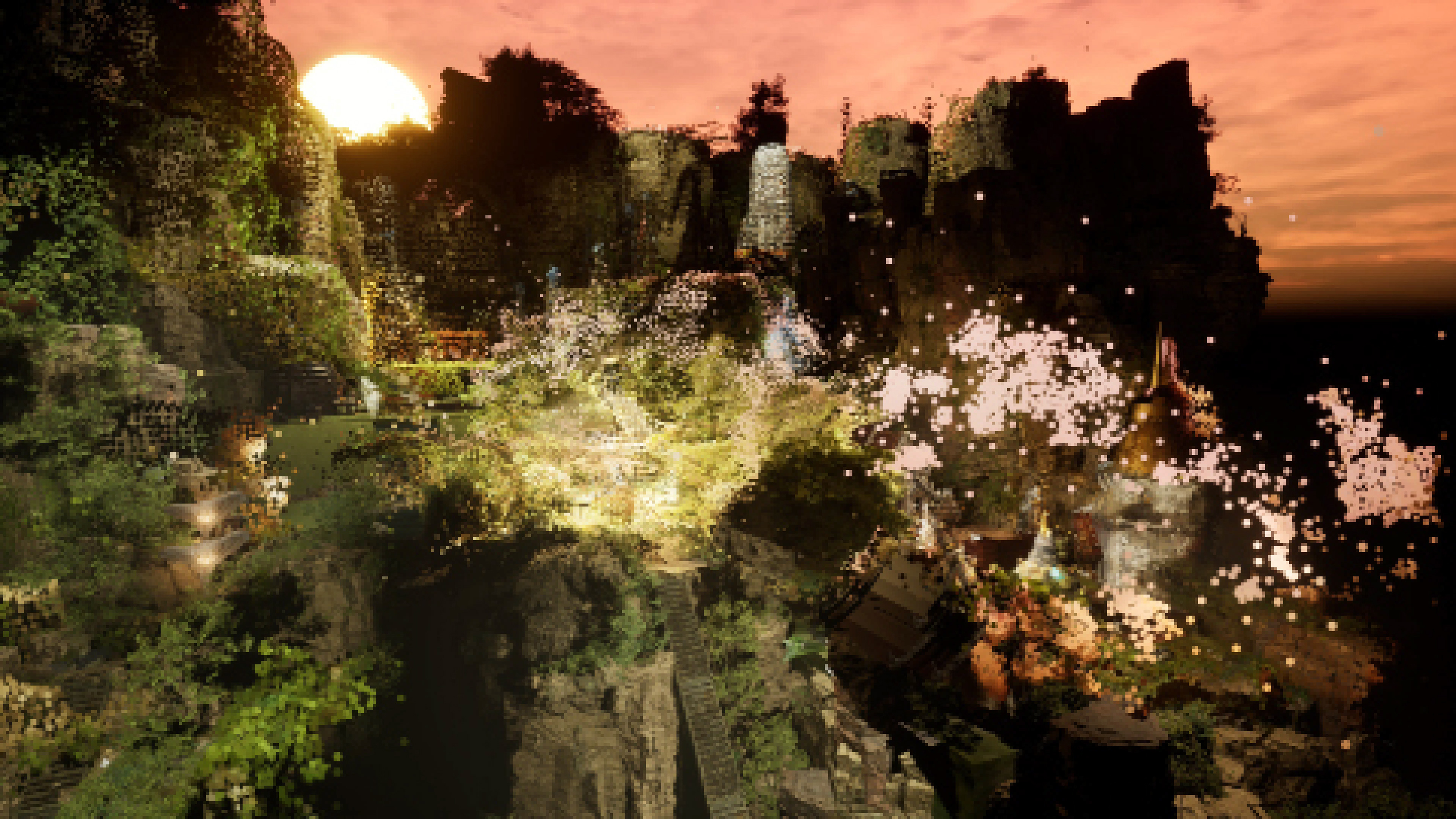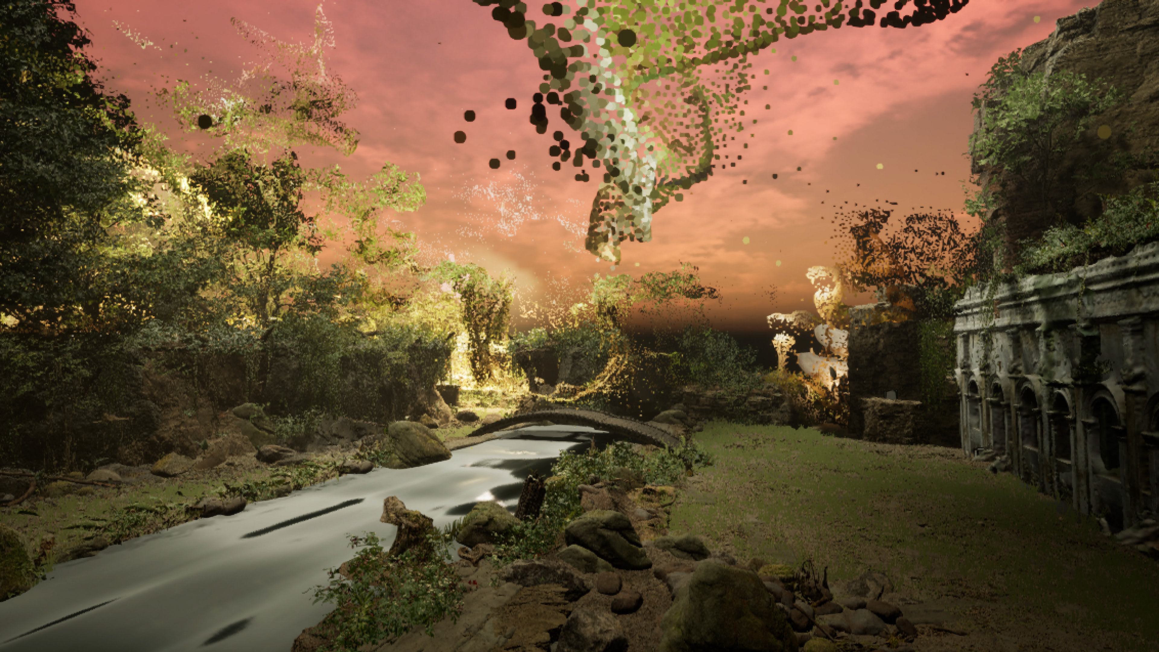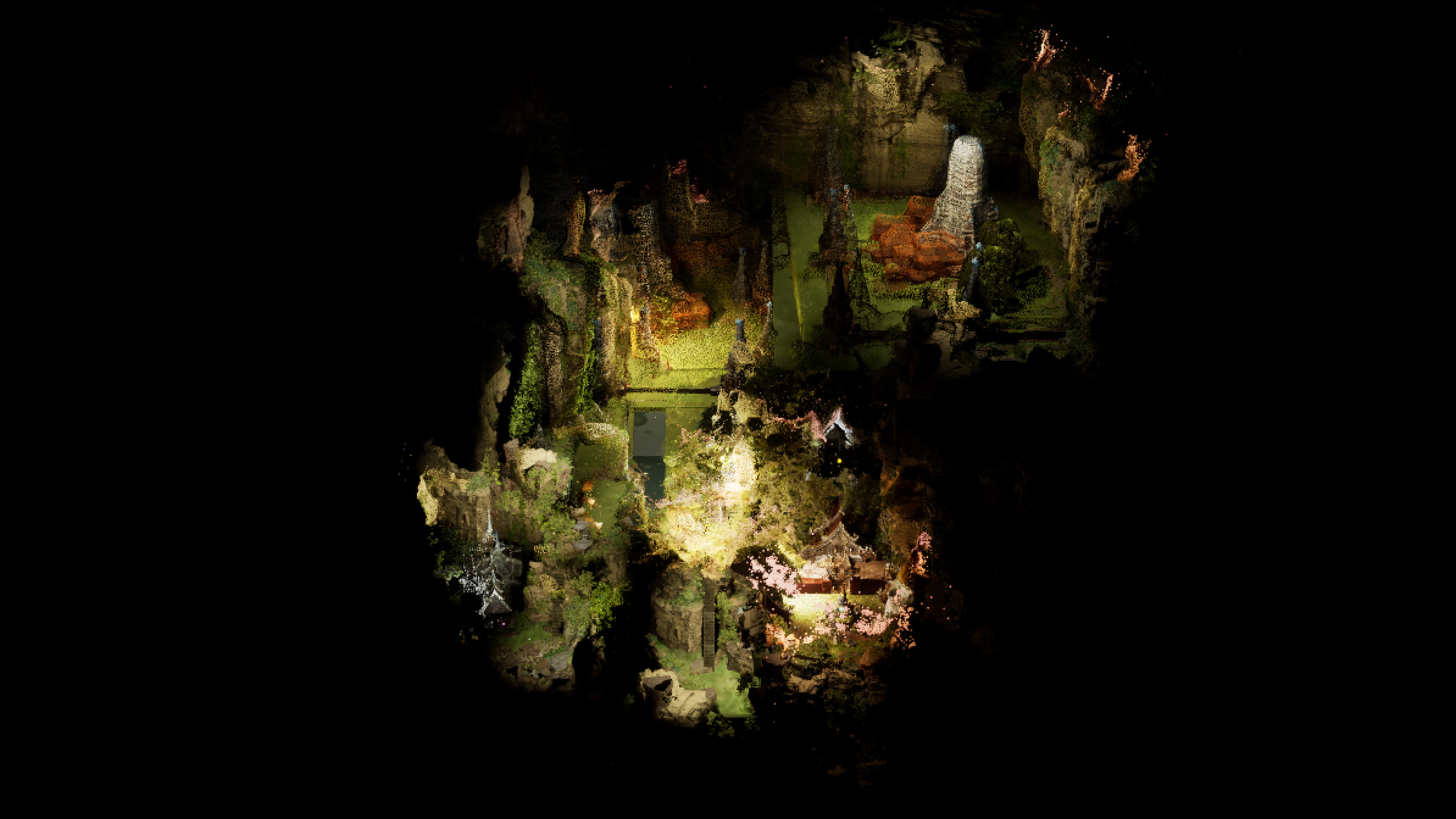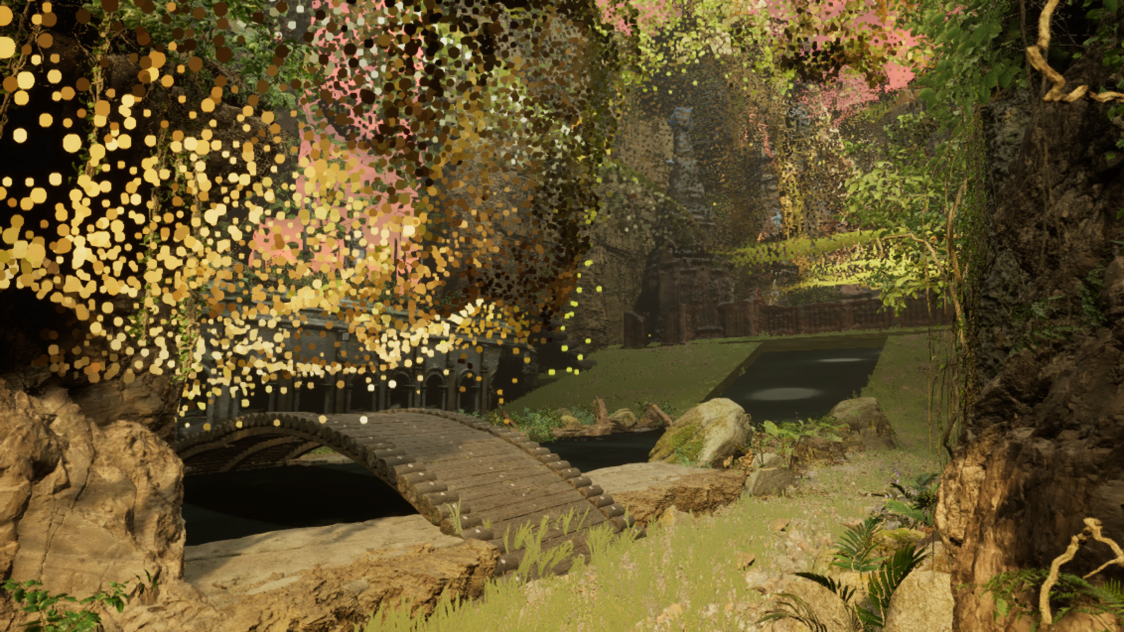 Point-cloud scene prototype for game environment: Set up the environment with photogrammetry assets, render, and remake the point cloud from a digital version of the place, then put it back to create the illusion effect.